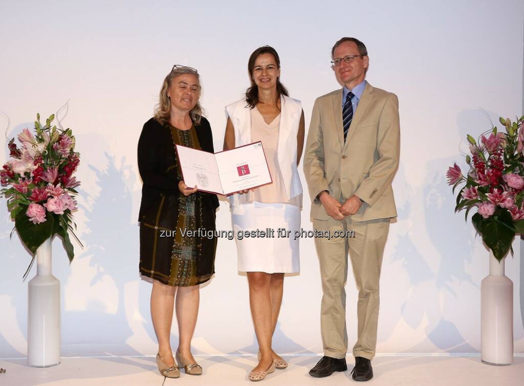 Staatspreis Familienfreundlichster Betrieb: LeitnerLeitner unter den besten drei: Bundesministerin Sophie Karmasin, Julia Waldhauser (LeitnerLeitner), Lothar Egger (LeitnerLeitner) , © Aussendung (13.06.2014)