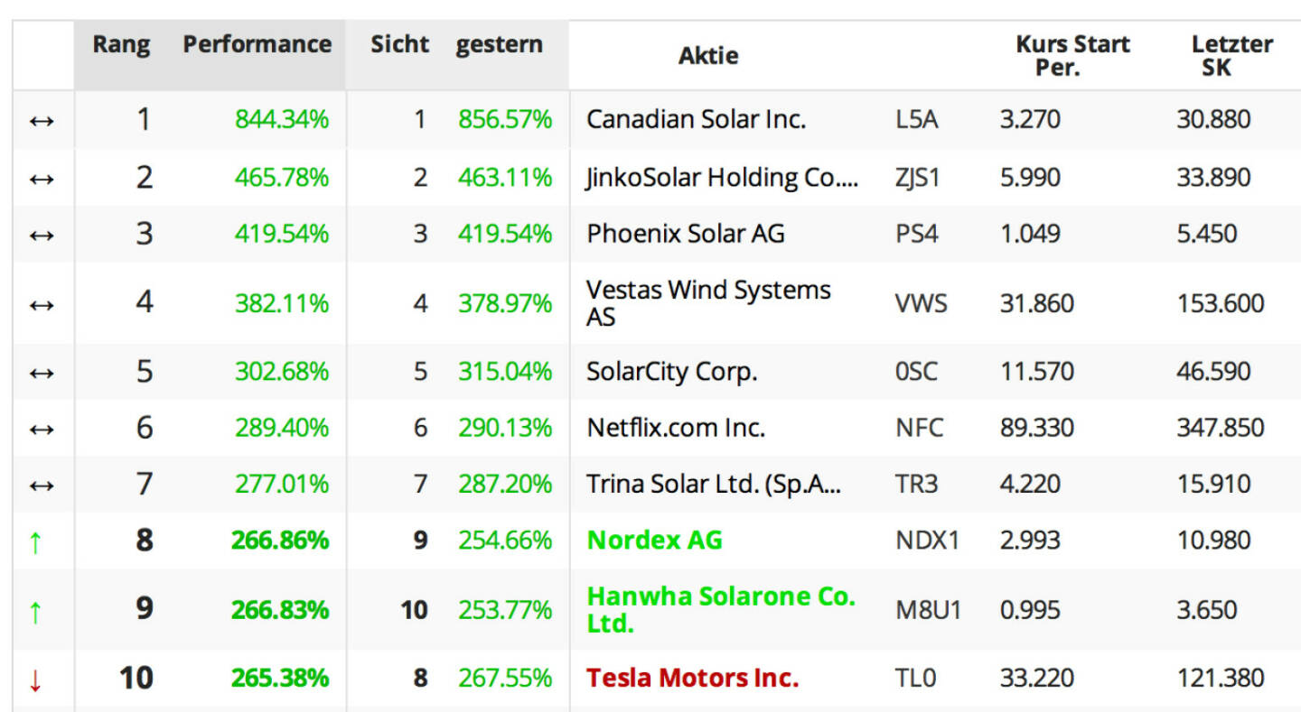 Verwendet in Visual Tagesthemen: Canadian Solar, Jinko, Phoenix, Vestas Wind, SolarCity, Netflix, Trina Solar, Nordex, Hanwha, Tesla als Trendaktien (Grafik)
