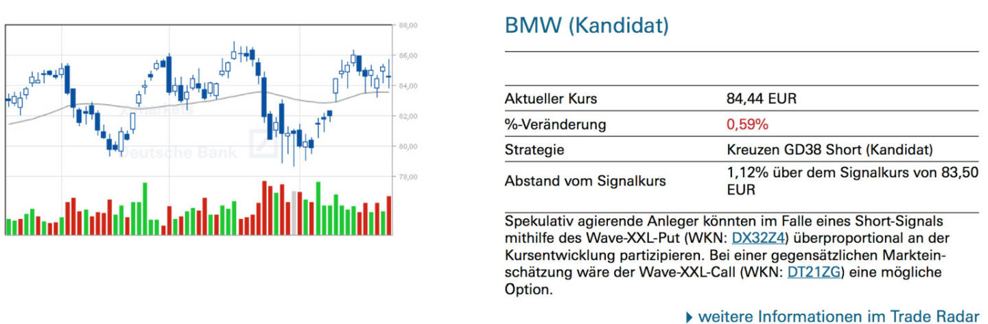 BMW (Kandidat): Spekulativ agierende Anleger könnten im Falle eines Short-Signals mithilfe des Wave-XXL-Put (WKN: DX32Z4) überproportional an der Kursentwicklung partizipieren. Bei einer gegensätzlichen Markteinschätzung wäre der Wave-XXL-Call (WKN: DT21ZG) eine mögliche Option.