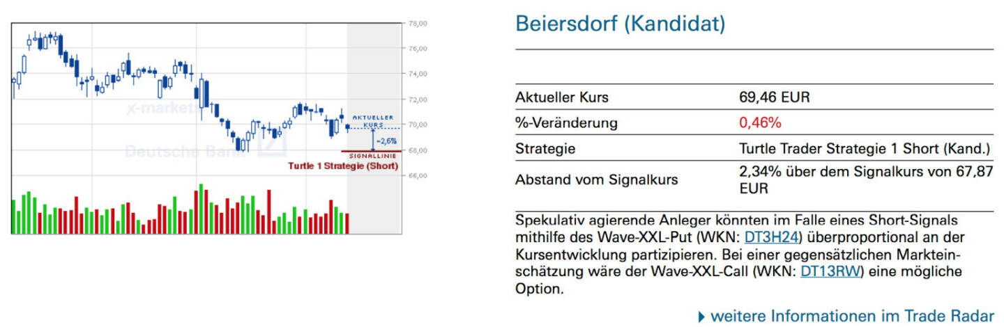 Beiersdorf (Kandidat): Spekulativ agierende Anleger könnten im Falle eines Short-Signals mithilfe des Wave-XXL-Put (WKN: DT3H24) überproportional an der Kursentwicklung partizipieren. Bei einer gegensätzlichen Markteinschätzung wäre der Wave-XXL-Call (WKN: DT13RW) eine mögliche Option.
