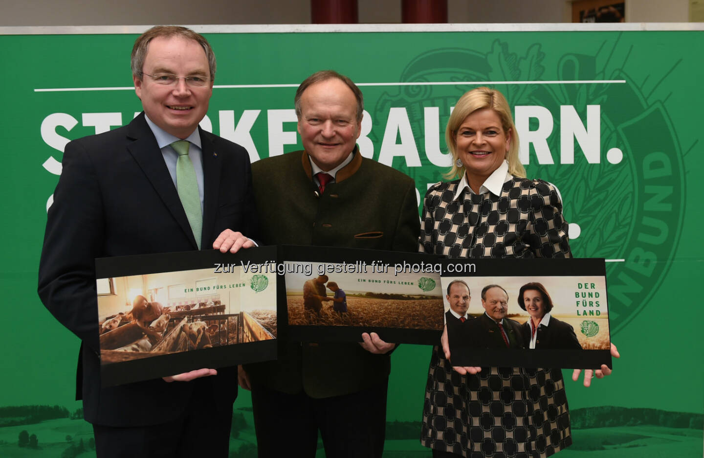 „Ein Bund fürs Land“: Agrar-Landesrat Stephan Pernkopf, NÖ Bauernbundobmann Hermann Schultes und Bauernbunddirektorin Klaudia Tanner mit Wahlsujets.: NÖ Bauernbund präsentiert Kandidaten und Programm für Landwirtschaftskammerwahl 2015