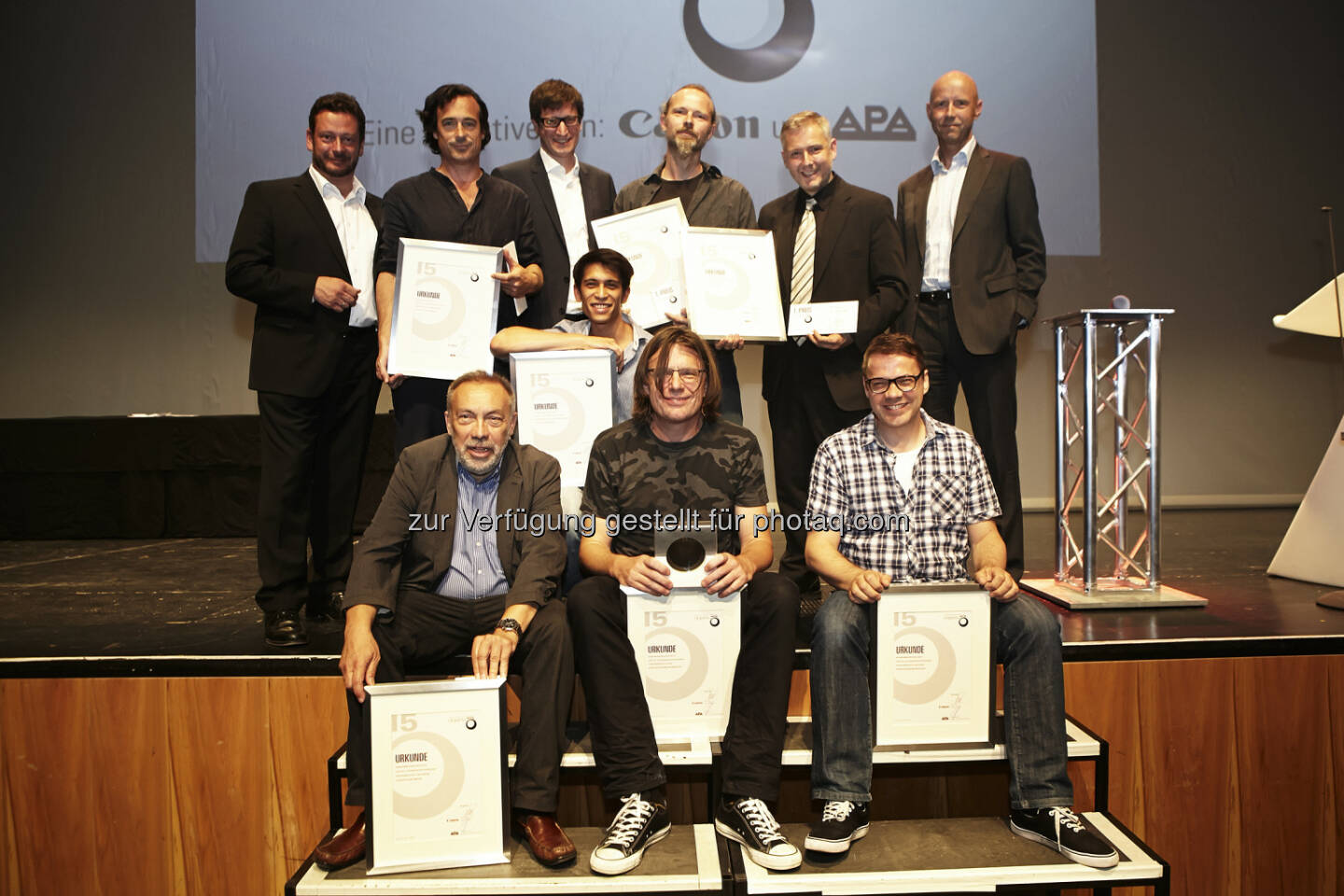 1. Reihe v.l.n.r.: Walter Wobrazek (Kategoriesieger Ikonen), Christian Fischer (Gesamtsieger sowie Kategoriesieger Innen- und Außenpolitik), Georg Hochmuth (Kategoriesieger Kunst und Kultur), 2. Reihe: Daniel Schaler (Kategoriesieger Chronik), 3. Reihe: Michael Lang (APA-Chefredakteur), Philipp Horak (Kategoriesieger Fotoserien), Klemens Ganner (Geschäftsführer APA-PictureDesk), Helmut Graf (Kategoriesieger Wirtschaft), Heinz-Peter Bader (Kategoriesieger Sport), Peter Saak (Geschäftsführer Canon Österreich).: APA - Austria Presse Agentur: "Objektiv 2015" - Pressefotos des Jahres zum 10. Mal ausgezeichnet