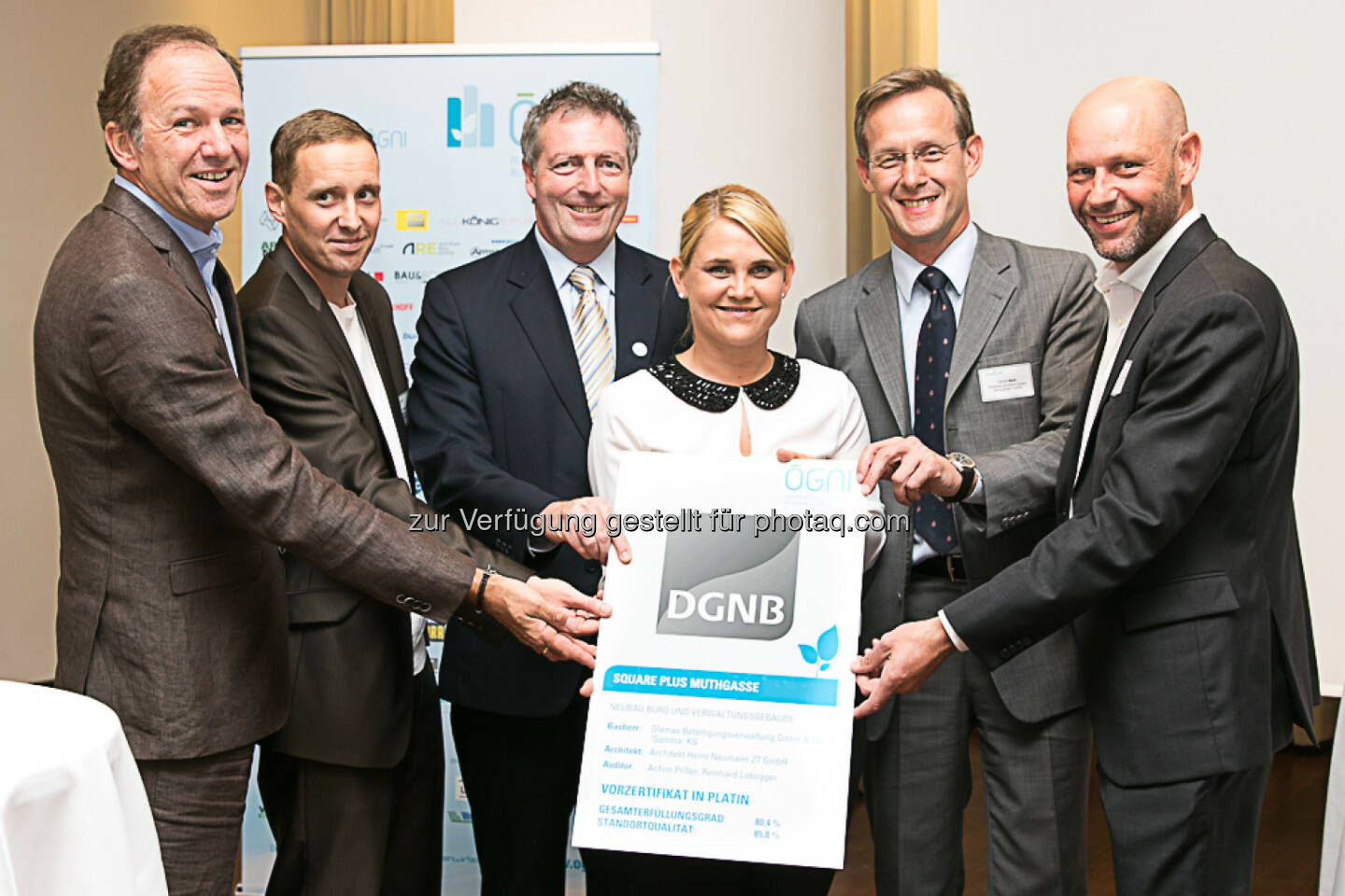 Reinhard Labugger (Ögni Auditor), Achim Priller, Christian Kerth (beide Raiffeisen evolution), Ines Reiter (Ögni), Gerald Beck, Bernhard Weixelbraun (beide Raiffeisen evolution) : Österreichische Gesellschaft für Nachhaltige Immobilienwirtschaft : erste Auszeichnung in Platin geht an Raiffeisen evolution : Fotocredit: CityFoto