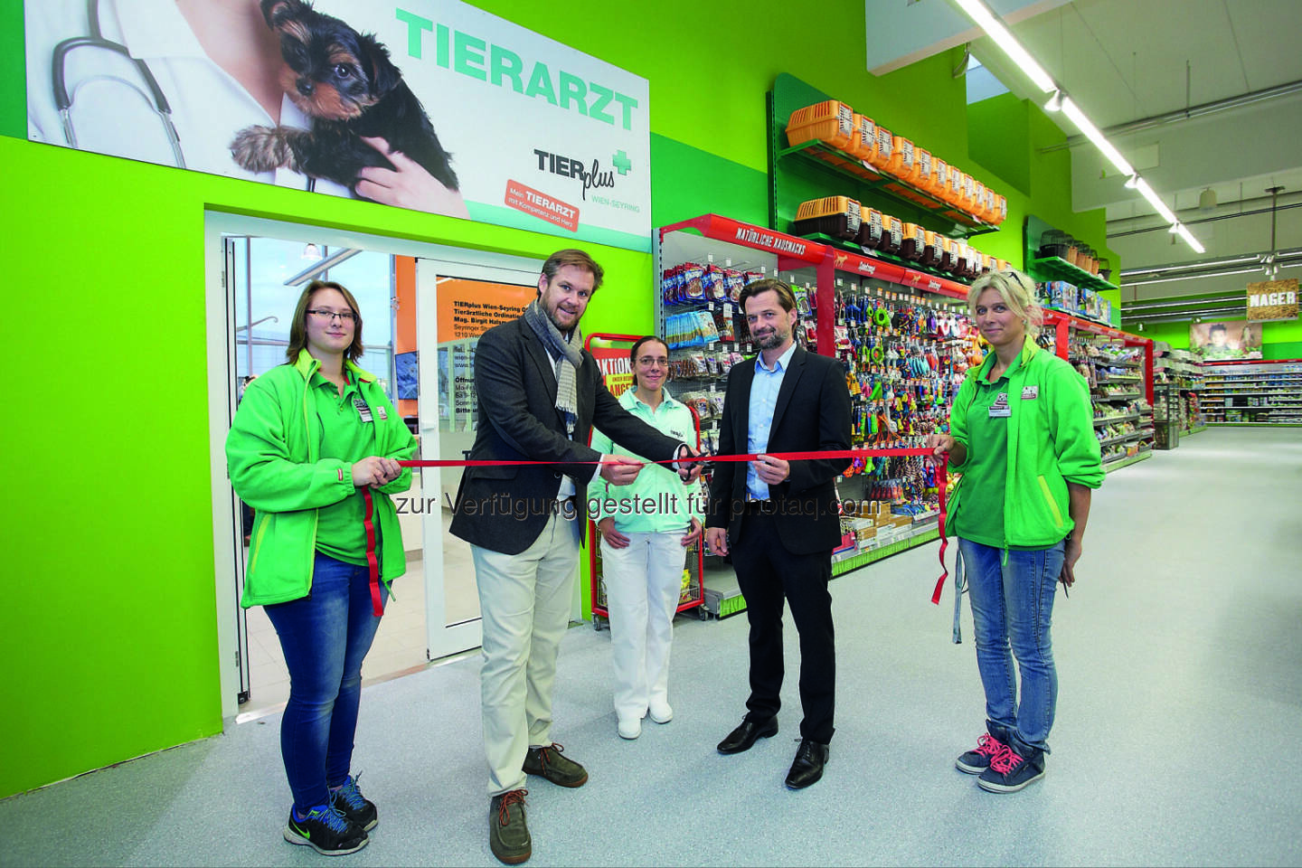 Nadine Schalek (Fressnapf-Lehrling), Herwig Pucher (Geschäftsführer Tierplus), Birgit Halsmayer (tierärztliche Leiterin Standort Tierplus Wien-Seyring), Norbert Marschallinger (Geschäftsführer Fressnapf Österreich), Andrea Fitz (Fressnapf-Filialleitung) : Zum Tierarzt bei Fressnapf : Erste Tierarztpraxis eröffnet in Fressnapf-Filiale Wien-Seyring : Fotocredit: Fressnapf