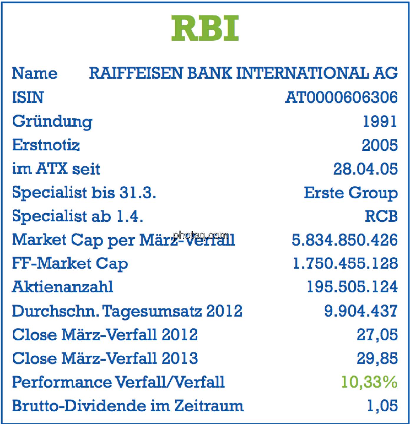 RBI: Stammdaten der Aktie per März-Verfall 2013 - Name, ISIN, Gründung, Erstnotiz, im ATX seit ... , Specialist, Market Cap, Free Float Market Cap, Aktienanzahl, Tagesumsatz, Dividende - Teil des Posters von http://www.christian-drastil.com/fachheft/