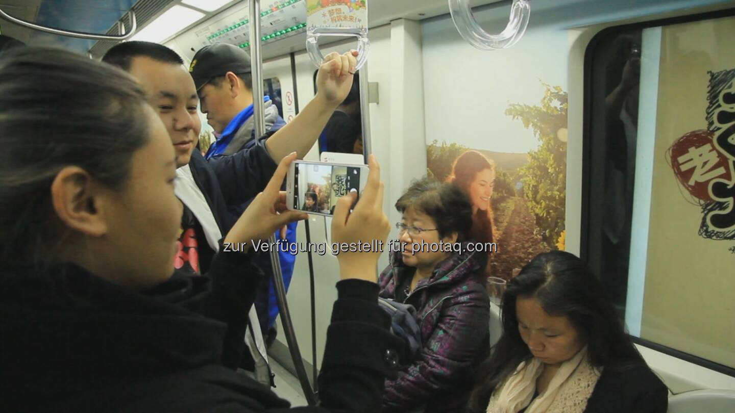 Passagiere in der Österreich-gebrandeten U-Bahn in Peking : Österreich-Rundreise mit der U-Bahn : Von 29. März bis 28. April 2016 werden in Peking zwei U-Bahn-Züge der Linie 10 - an der gesamten Innenseite mit österreichischen Motiven beklebt - unterwegs sein : Fotocredit: Österreich Werbung