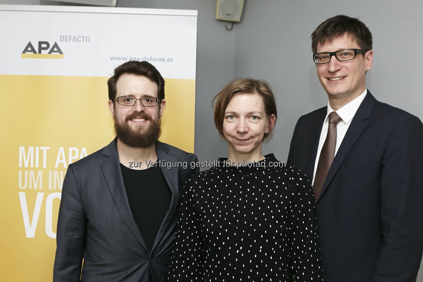 Manuel Kerzner (Medienanalyst APA-DeFacto), Katharina Schell (Leiterin Ressort Innenpolitik, APA), Klemens Ganner (Leiter APA-DeFacto) : Veranstaltung „DeFacto-Highlight“ zum Trendthema Politik und Medien –– Echtzeit-Berichterstattung prägt Medienkonsum : Fotocredit: APA-Fotoservice / Roßboth
