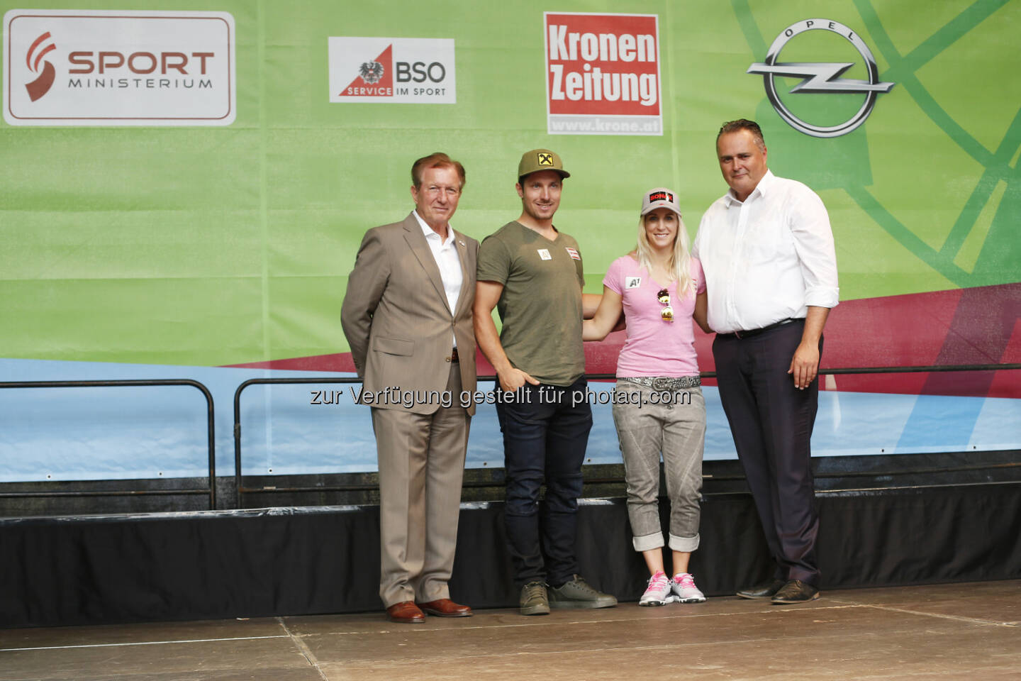 BSO-Präsident Herbert Kocher, Marcel Hirscher, Eva-Maria Brem und Sportminister Hans Peter Doskozil auf der Tag des Sports-Bühne - BSO: Erfolgreicher Tag des Sports 2016 – Wiener Prater als perfekte Bühne (Bild: Sportministerium/Agentur Diener)