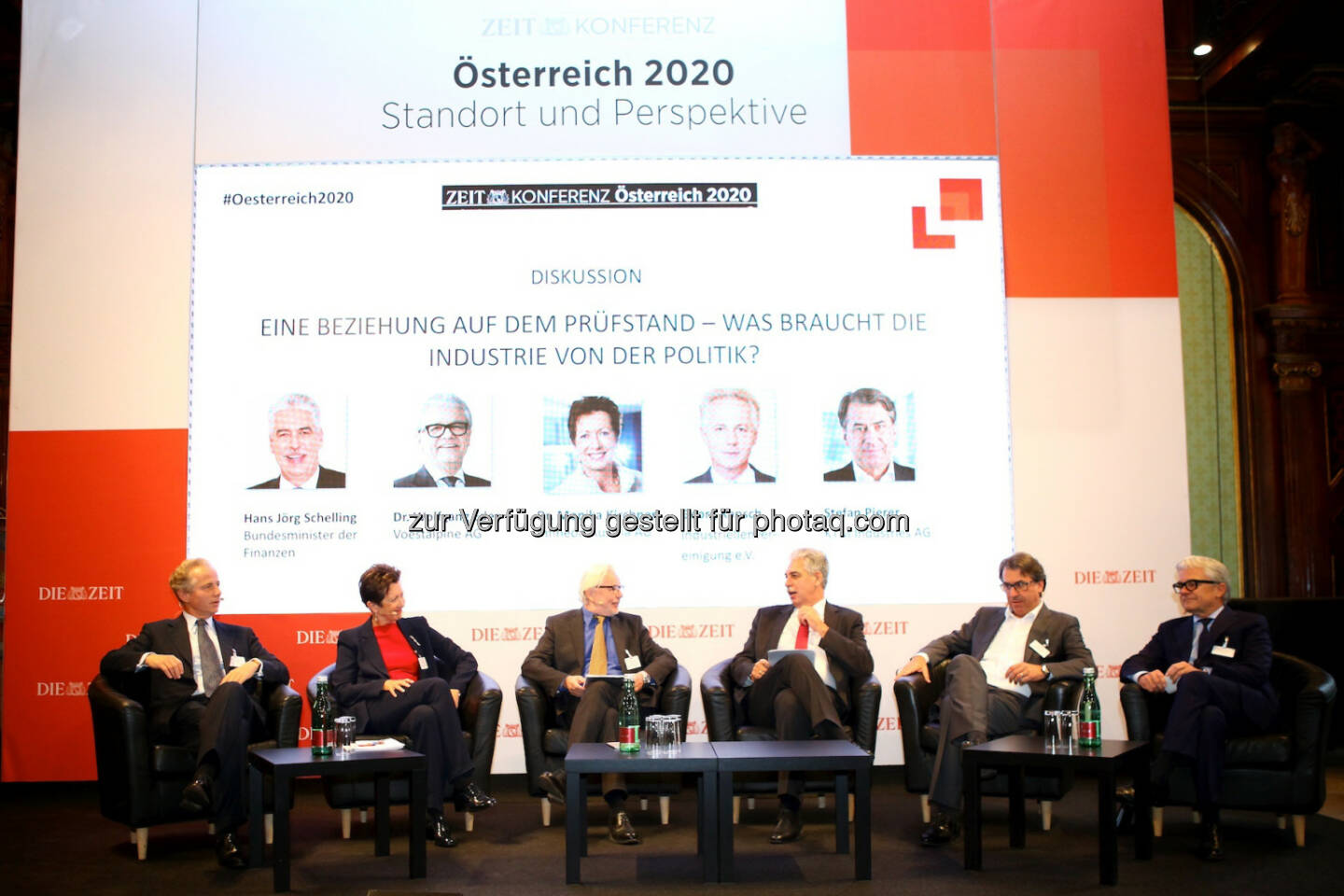 Georg Kapsch (Präsident der Industriellenvereinigung), Monika Kirchner (Senior Director Industrial Affairs der Infineon AG), Joachim Riedl (Leiter des Wiener Büros der ZEIT), Hans Jörg Schelling (Finanzminister), Stefan Pierer (CEO KTM Industries AG), Wolfgang Eder (CEO der voestalpine AG) : "ZEIT Konferenz" in Wien: Herausforderungen und Perspektiven des Wirtschaftsstandortes im Fokus : Fotocredit: Elisabeth Kessler
