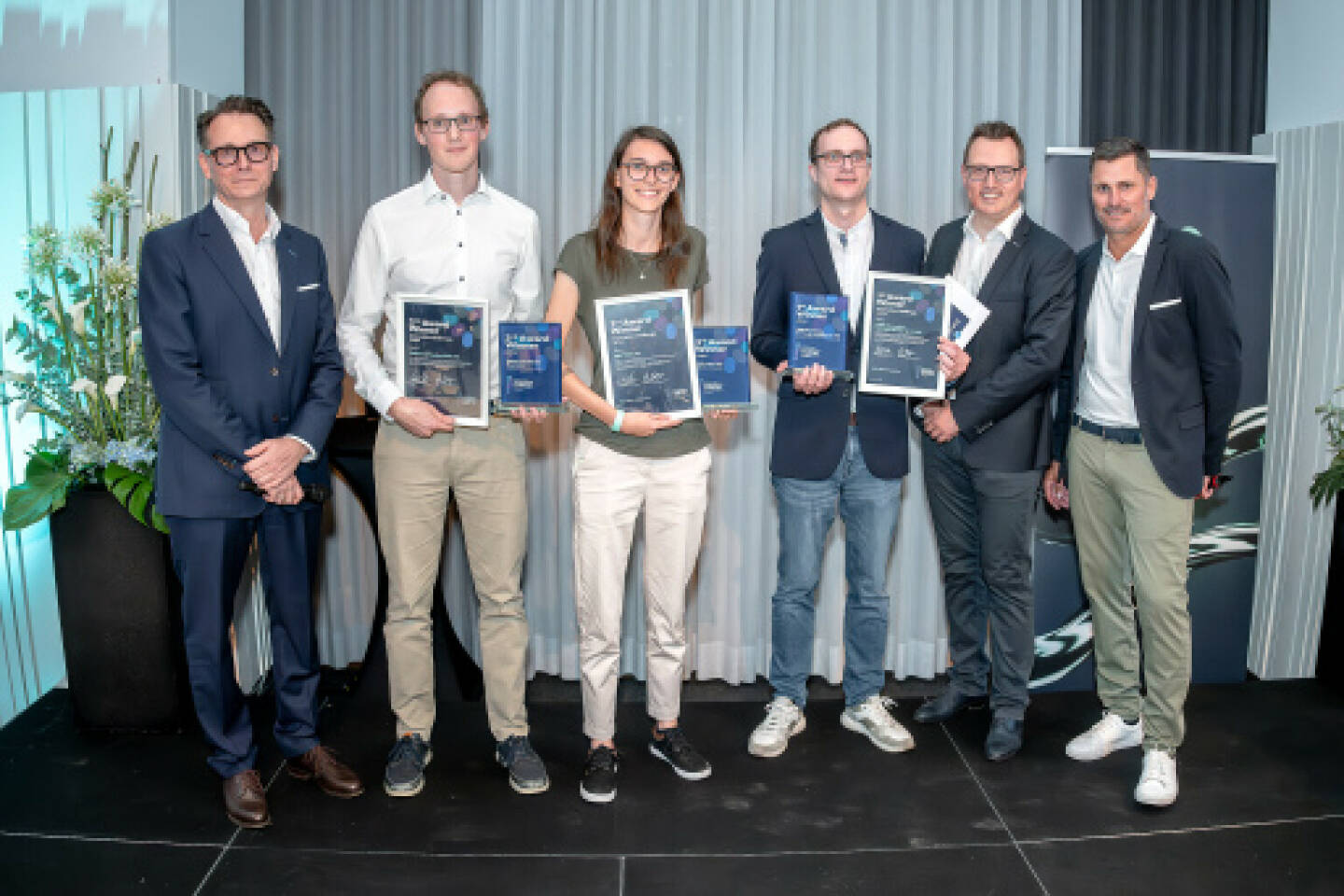 Die Innovation Award Gewinner 2024: v.l.n.r. Paul Haberfellner (Nagarro), Florian Waas-Filp ( Österreichische Post), Daphne Vandijken (Dectris), Michael Köstinger (ÖBB), Michael Frank (Nagarro), Mario Berger (Google Cloud); Foto: Nagarro