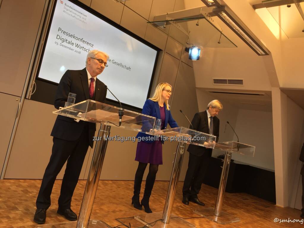 Pressekonferenz Digitalisierung 3.12.18: CEO Pölzl (Post), BM Schramböck, CEO Strobl ( RBI) (03.12.2018)