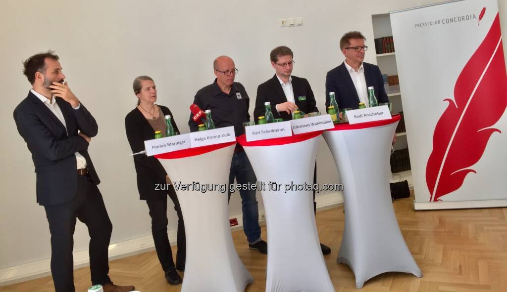 v.l.n.r.: Johannes Wahlmüller, GLOBAL2000; Christian Sagmeister, ÖBB-Infrastruktur AG; Cornelia Daniel, Dachgold&Tausendundein Dach; Tanja Dietrich-Hübner, REWE International AG; Karl Schellmann, WWF Österreich; PK "Solarinitiative" 6.8.19 (06.08.2019)