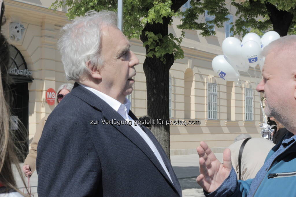 EU-Kandidat Voggenhuber genießt das Bad in der Menge und nimmt Ratschläge für die Positionierung seiner Bewegung entgegen, Museumsquartier, 18.4.19 (18.04.2019)