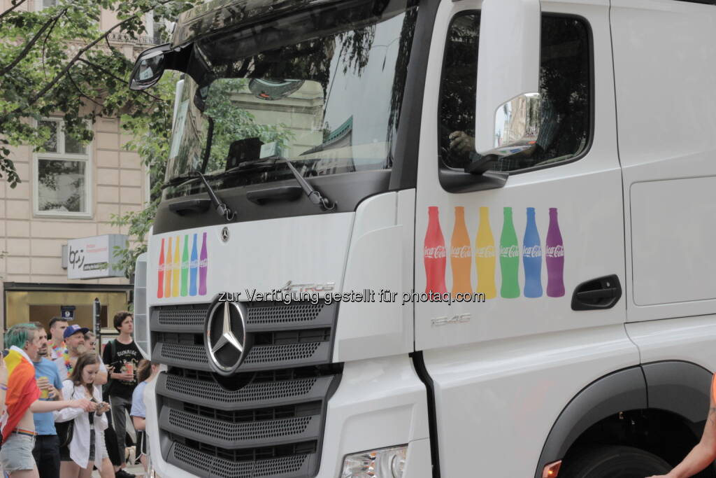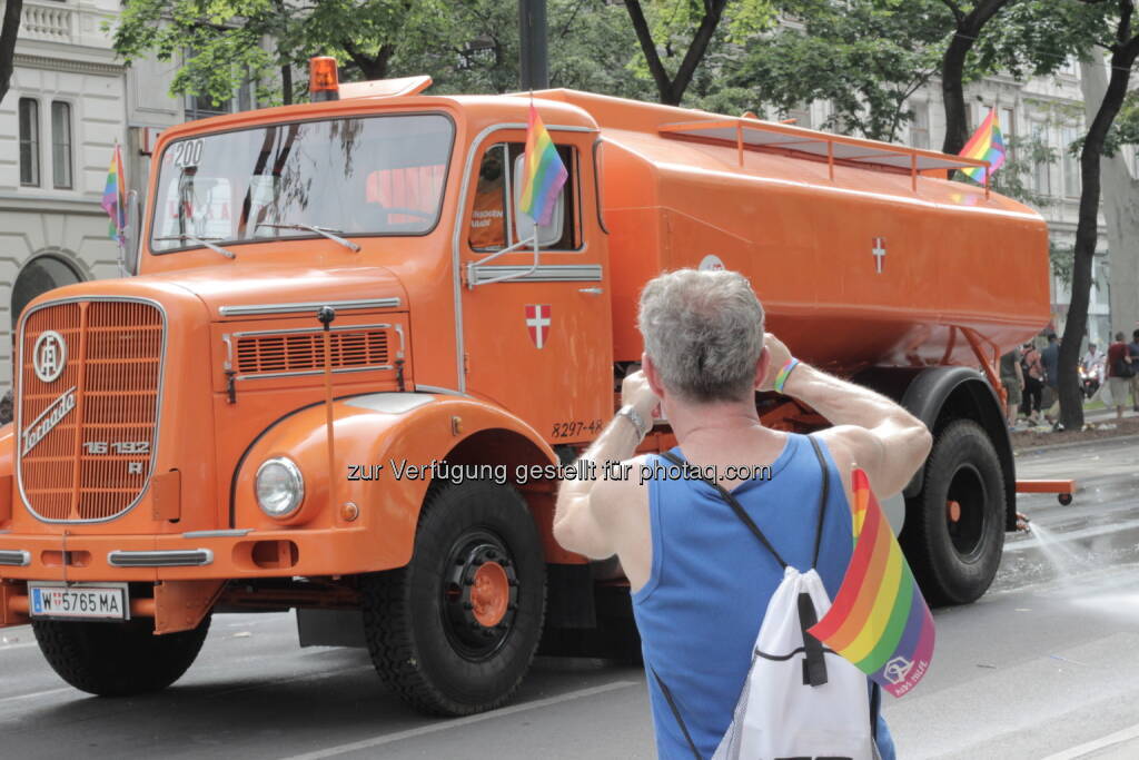 Fast 50jähriger ÖAF-Tornado in Orange, ÖAF ist nun MAN, gehört zu Volkswagen. Lkw ist offenbar immer noch im Einsatz. Regenbogenparade Wien 15.6.19 (16.06.2019)