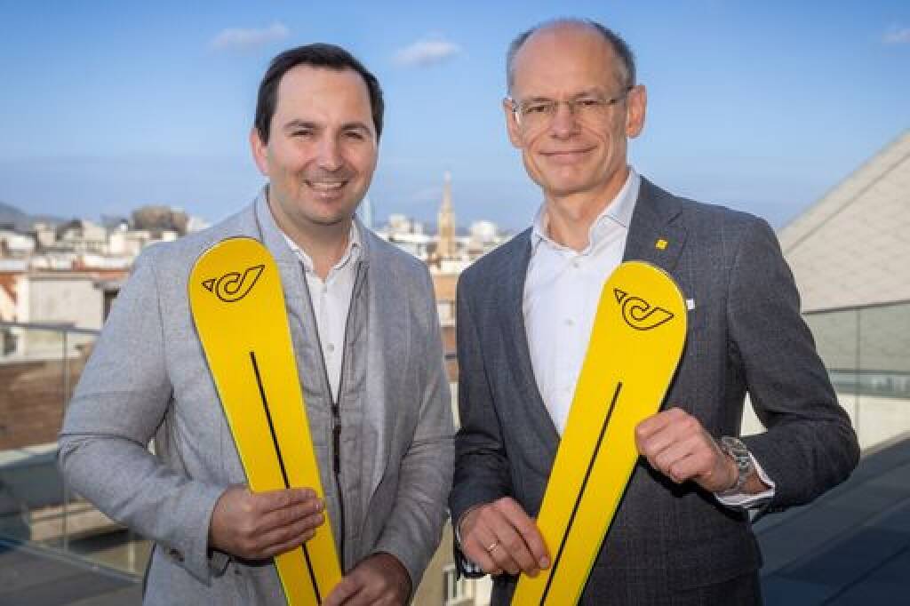 Österreichische Post ist nationale Partnerinder Ski-WM 2025 in Saalbach; v.l.: ÖSV-Geschäftsführer Christian Scherer mit Post-Generaldirektor Walter Oblin, Fotograf:in: Christian Houdek, Fotocredit: Österreichische Post AG © Aussender (08.01.2025)