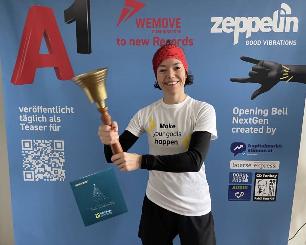 Claudia Eder, Managing Director der Asfinag Maut Service Gesellschaft, läutet eine weitere Opening Bell für unseren Manager:innen-Weihnachtssong, der dieser Tage Gast für Gast eingesungen wird und nächste Woche gepublished. (16.12.2025)