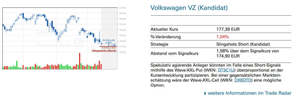 Volkswagen VZ (Kandidat): Spekulativ agierende Anleger könnten im Falle eines Short-Signals mithilfe des Wave-XXL-Put (WKN: DT3C1U) überproportional an der Kursentwicklung partizipieren. Bei einer gegensätzlichen Markteinschätzung wäre der Wave-XXL-Call (WKN: DX8DTD) eine mögliche Option., © Quelle: www.trade-radar.de (17.03.2014)