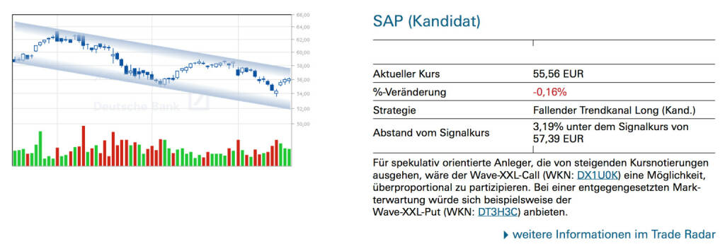 SAP (Kandidat): Für spekulativ orientierte Anleger, die von steigenden Kursnotierungen ausgehen, wäre der Wave-XXL-Call (WKN: DT0RMR) eine Möglichkeit, überproportional zu partizipieren. Bei einer entgegengesetzten Markterwartung würde sich beispielsweise der Wave-XXL-Put (WKN: DT3DQ0) anbieten., © Quelle: www.trade-radar.de (25.03.2014)