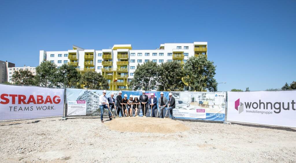 wohngut Immobiliengruppe: „DUO22“: Spatenstich für 128 freifinanzierte Eigentumswohnungen in der Donaustadt, Strabag; Fotograf: Martin Kruckenfellner, Fotocredit: wohngut Bauträger GmbH (03.08.2017)