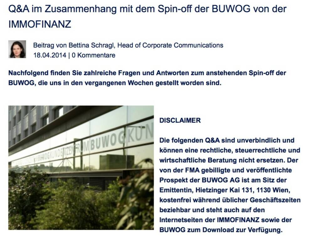 Q&A im Zusammenhang mit dem Spin-off der Buwog von der Immofinanz. Bettina Schragl, Head of Corporate Communications Immofinanz, beantwortet im Company Blog zahlreiche Fragen und Antworten zum anstehenden Spin-off der Buwog. Siehe http://blog.immofinanz.com
