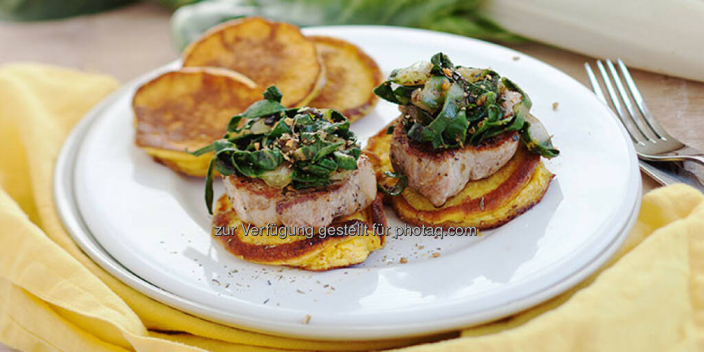 Schweinskarree auf Kurkuma-Pancakes mit Mangoldgemüse - http://www.kochabo.at/schweinskarree-auf-kurkuma-pan..., © kochabo.at (05.05.2014)