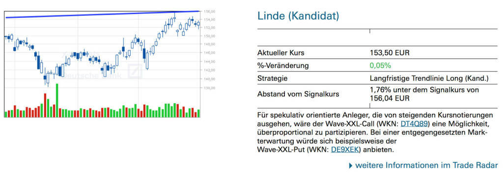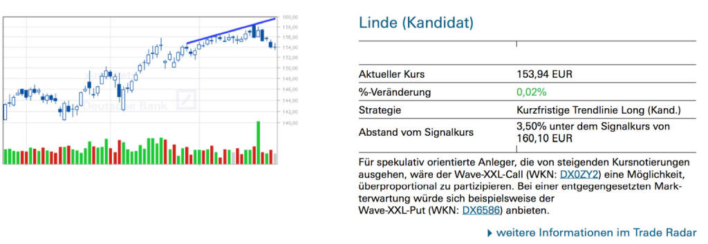 Linde (Kandidat): Für spekulativ orientierte Anleger, die von steigenden Kursnotierungen ausgehen, wäre der Wave-XXL-Call (WKN: DX0ZY2) eine Möglichkeit, überproportional zu partizipieren. Bei einer entgegengesetzten Markterwartung würde sich beispielsweise der Wave-XXL-Put (WKN: DX6586) anbieten., © Quelle: www.trade-radar.de (27.06.2014)