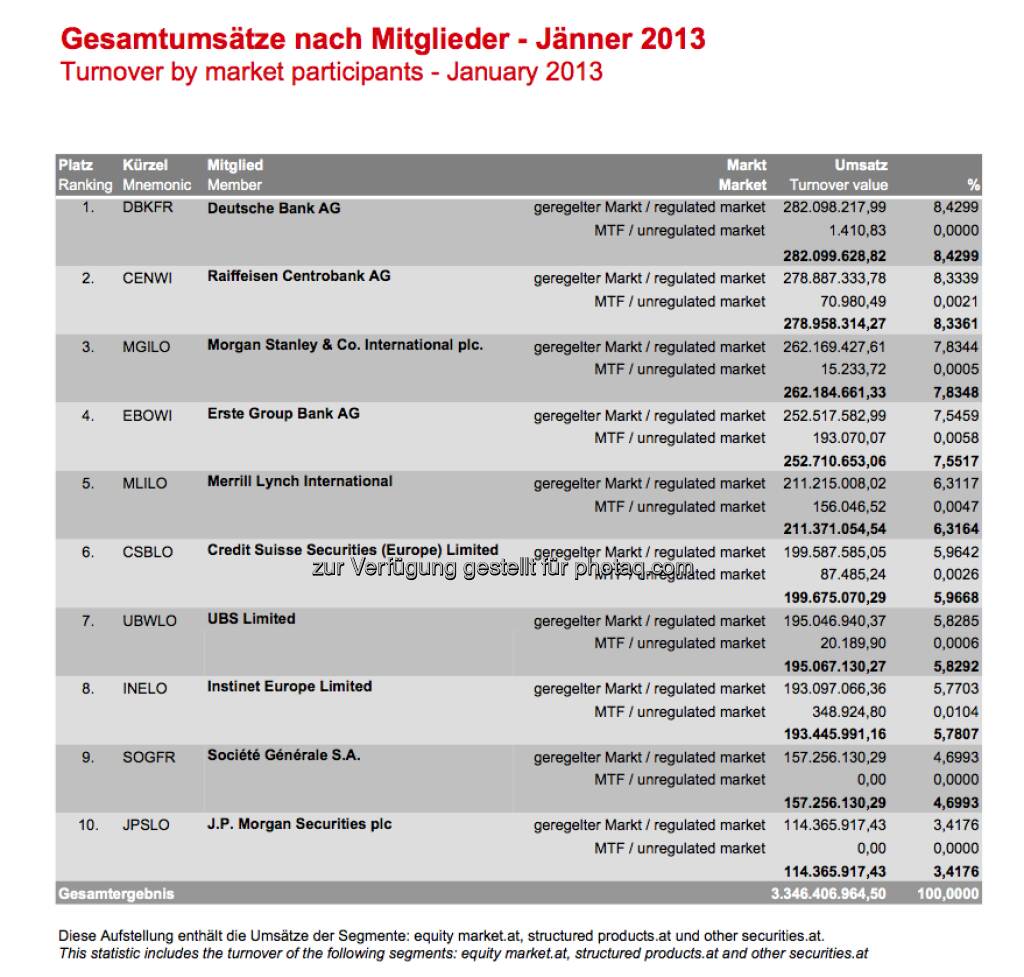 Deutsche Bank Umsatz Nr. 1 an der Wiener Börse im Jänner, dahinter die RCB, Morgan Stanley und die Erste Group ( (c) Wiener Börse (08.02.2013)