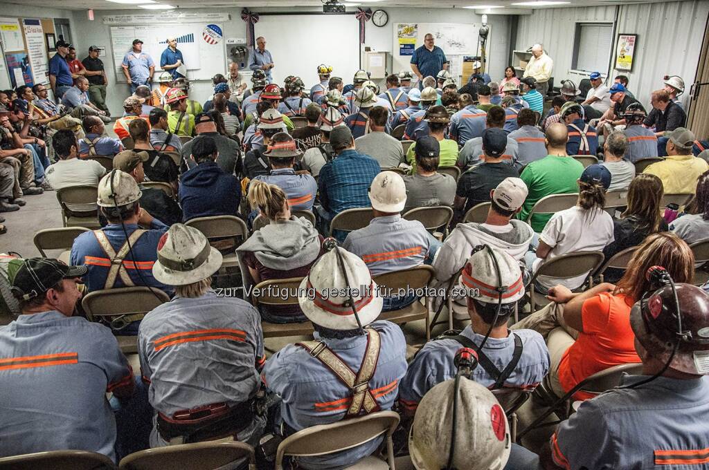Barrick Gold: Pre-shift lineout meetings get everyone together for safety briefings and other updates. This crew includes miners, mechanics, truck drivers, assayers, surveyors, engineers, geologists, superintendents and environmental staff — all with critical roles making sure every person goes home safe and healthy every day. (Photo by Ed Tester) Source: http://facebook.com/barrick. gold.corporation, © Aussender (03.02.2016)