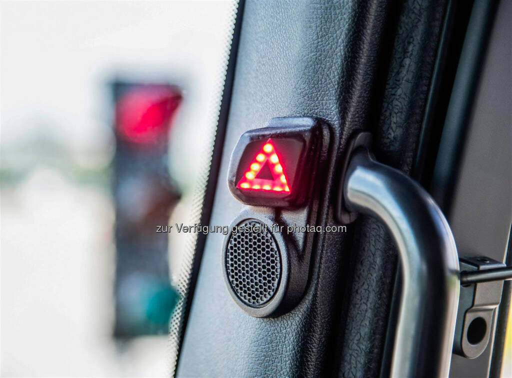 Mercedes-Benz Blind Spot Assist / Interior - LED Warning: Der neue Blind Spot Assist von Mercedes-Benz warnt den Fahrer zuverlässig vor Gefahren beim Abbiegen in kritischen Situationen mit eingeschränkter Sicht. Und er berücksichtigt ebenfalls die Schleppkurve des Aufliegers und warnt deshalb auch bei Kollisionsgefahr mit stationären Hindernissen wie Ampeln oder Laternen. Darüber hinaus unterstützt er den Fahrer beim Spurwechsel., © Aussendung (02.09.2014)