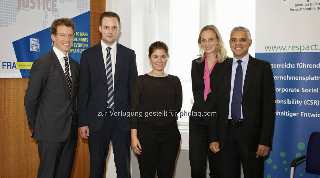 Richard Bachinger, OMV; Florian Schönberger, BMWFW; Alice Pedretti, CSR Europe; Daniela Knieling, respACT; John Kellock, Grundrechteagentur der EU: respACT - austrian business council for sustainable development: Wie betrifft österreichische Unternehmen das Thema Menschenrechte?, © Aussender (05.09.2014)