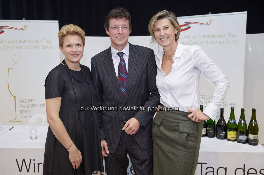 Steirereck-Patronin Birgit Reitbauer und Opernball Organisatorin Desirée Treichl-Stürgkh freuten sich über den Ausgang des Länderwettkampfes ebenso wie der Geschäftsführer des Österreichischen Weinkomitees Benedikt Zacherl: grosswerk e.U.: Österreichischer Sekt fordert Champagner heraus, © Aussender (21.10.2014)