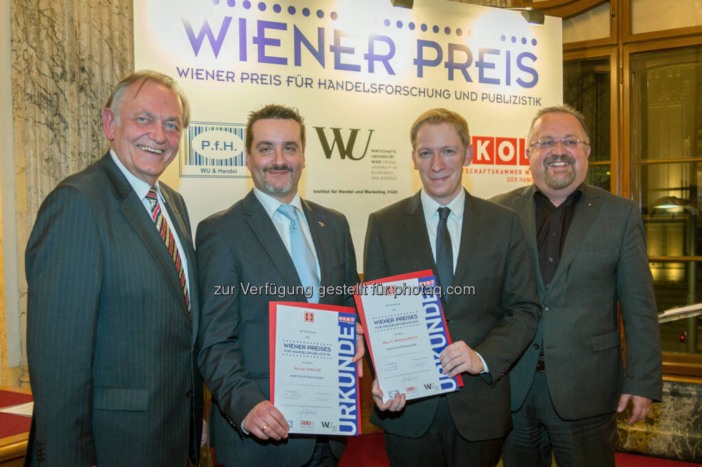 Obmann der Sparte Handel KommR Erwin Pellet, Handelspublizistik-Preisträger Michael Vorauer, Handelsforschung-Preisträger Wolfgang Weitzl, Vorstand des Instituts Handel und Marketing an der Wirtschaftsuniversität Wien, Peter Schnedlitz - Wirtschaftskammer Wien: Wiener Handel und Wirtschaftsuniversität vergeben Preis für Handelsforschung und -publizistik (Bild: Michael Weinwurm), © Aussendung (16.12.2014)