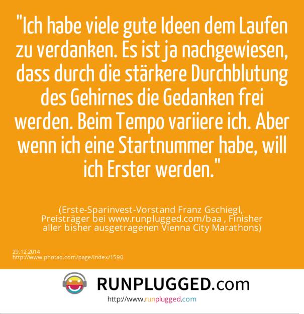 "Ich habe viele gute Ideen dem Laufen zu verdanken. Es ist ja nachgewiesen, dass durch die stärkere Durchblutung des Gehirnes die Gedanken frei werden. Beim Tempo variiere ich. Aber wenn ich eine Startnummer habe, will ich Erster werden."