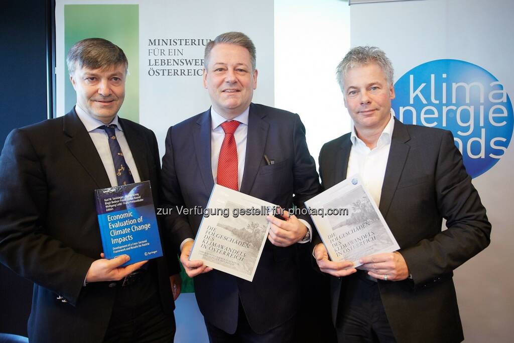 Karl Steininger, Studienautor und Professor an der Karl-Franzens-Universität, Andrä Rupprechter, Bundesminister für Land- und Forstwirtschaft, Umwelt und Wasserwirtschaft und Ingmar Höbarth, Geschäftsführer Klima- und Energiefonds: Klima- und Energiefonds: Klimawandel verursacht jährlich bis zu 8,8 Mrd. Euro Schaden bis 2050, © Aussender (15.01.2015)