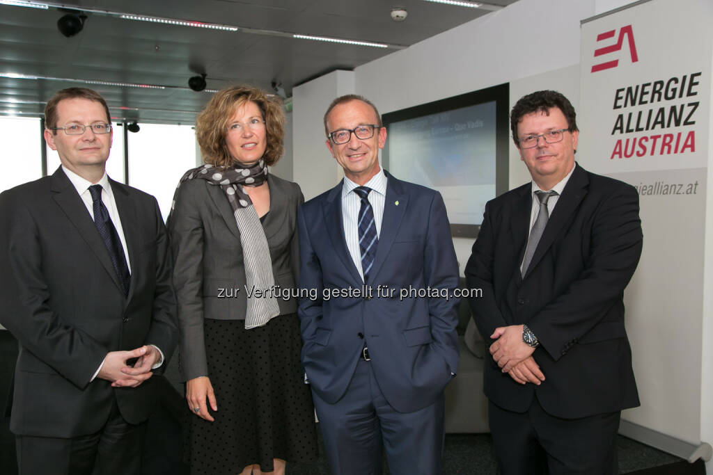 Werner Perz (Energie Allianz Austria-GF), Gerhard Christiner (techn. Vorstand Austria Power Grid /APG), Jochen Homann (Präsident deutsche Bundesnetzagentur), Christian Wojta (EAA-GF) : EAA-Energie Talk: Gemeinsame Preiszone Deutschland-Österreich vor dem Aus? : Die deutsche Energiewende hat möglicherweise unangenehme Folgen für Österreichs Stromkunden : Fotocredit: EAA/Ludwig Schedl, © Aussendung (23.09.2015)