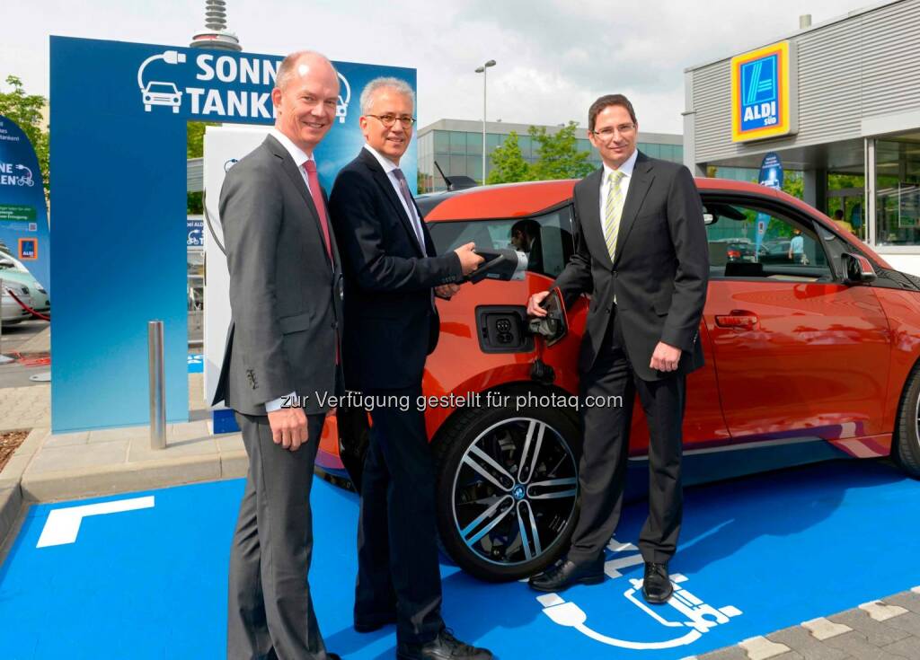 Dietrich Gemmel (Geschaeftsfuehrer RWE Effizienz GmbH), Staatsminister Tarek Al-Wazir und Karl-Heinz Kehl (Geschaeftsfuehrer Energiemanagement Aldi): Einweihung der neuen Stromtankstelle bei Aldi-Sued in Frankfurt, Foto: RWE/Berno Nix, © Aussendung (29.05.2015)