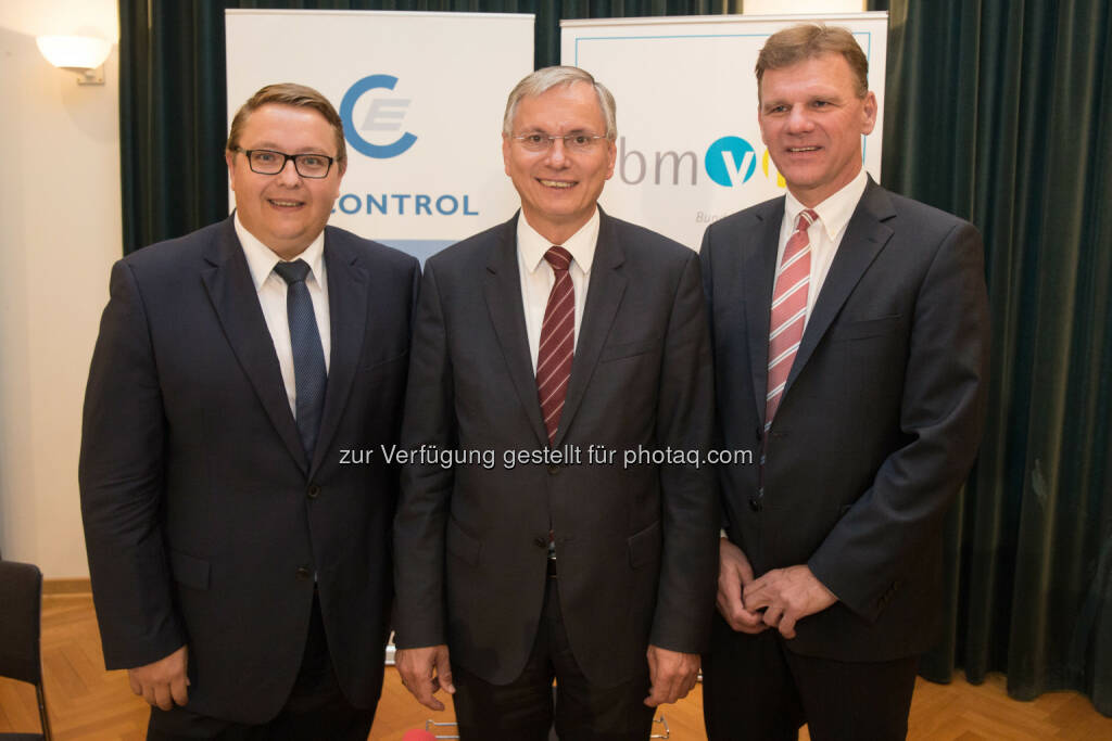 Martin Graf, Vorstand der Energie-Control Austria, Alois Stöger, Bundesminister für Verkehr, Innovation und Technologie und Michael Strebl, GF Salzburg Netz: Energie-Control Austria: Stöger/Graf/Strebl: Forschung & Entwicklung machen Österreich zum Frontrunner bei intelligenten Stromnetzen, © photonews.at/Georges Schneider , © Aussendung (30.06.2015)