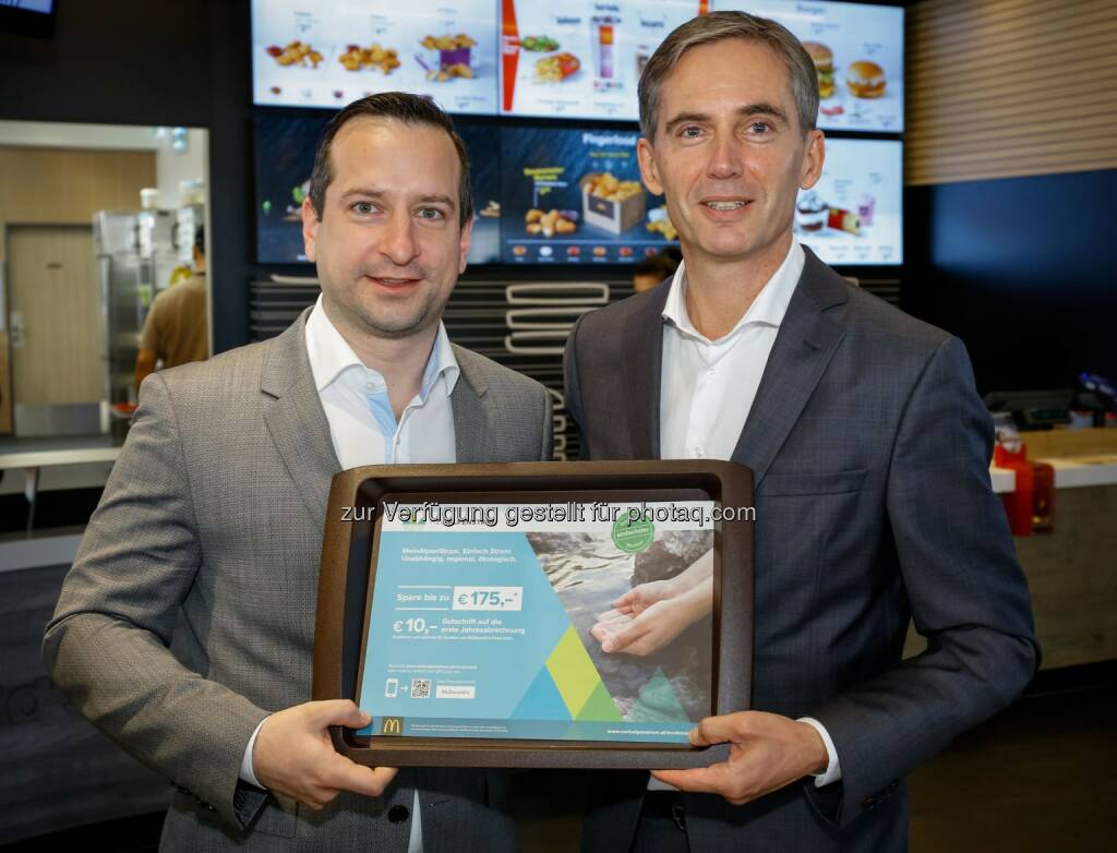 Philipp M. Rehulka (GF MeinAlpenStrom), Andreas Schmidlechner (Managing Director McDonald's Österreich) : Mit McDonald’s Österreich bis zu 175 Euro Stromkosten sparen : Gäste und Mitarbeiter profitieren von MeinAlpenStrom : Fotocredit: McDonald's Österreich/Husar, © Aussendung (30.10.2015)