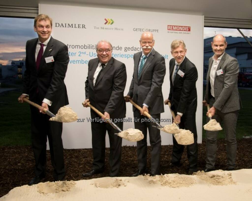 Klemens Rethmann (Rethmann Gruppe), Uwe Beckmeyer (Parl. Staatssekretär), Dieter Zetsche (CEO Daimler AG), Karl Gerhold (CEO Getec Group), Thomas Raffeiner (CEO The Mobilty House) : Spatenstich weltweit größter 2nd-use Batteriespeicher, Lünen, geht in Kürze ans Netz : Kooperation von Daimler, The Mobility House, Gete und Remondis schließt Batterie-Wertschöpfungskreislauf : Zweitverwertung elektroautomobiler Batterien verbessert Umweltbilanz und Lebenszykluskosten der E-Mobilität : © Daimler AG , © Aussendung (04.11.2015)