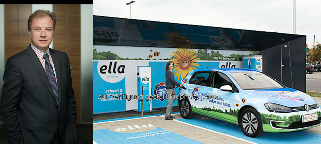Andreas Dangl (Gründer, Vorstand Ella AG, Fotocredit: Eric Krügl), E-Ladestation (Fotocredit: Hofer) : Ganz in Grün unterwegs : Ella AG als starker Partner : Bei Hofer steht nun auch die E-Mobilität im Fokus der Nachhaltigkeitsinitiative „Projekt 2020“ : Schnell und kostenlos während des Einkaufs laden , © Aussendung (26.11.2015)