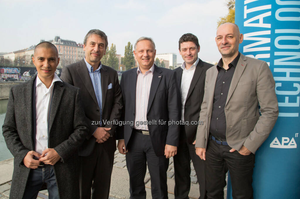 Michael Wagenhofer (GF ORS comm), Thomas Pöcheim (Obmann Verein Digitalradio Österreich), Alfred Grinschgl (GF Fachbereich Medien der RTR-GmbH), Bernie O´Neill (Project Director World DMB) und Wolfgang Struber (Obmann Stellvertreter Digitalradio): FEEI Management-Service GmbH: Digitalradio in Österreich ist on air - Start des Verbreitungsweges DAB+ läutet neue Ära des Hörfunks ein, © Aussender (28.05.2015)