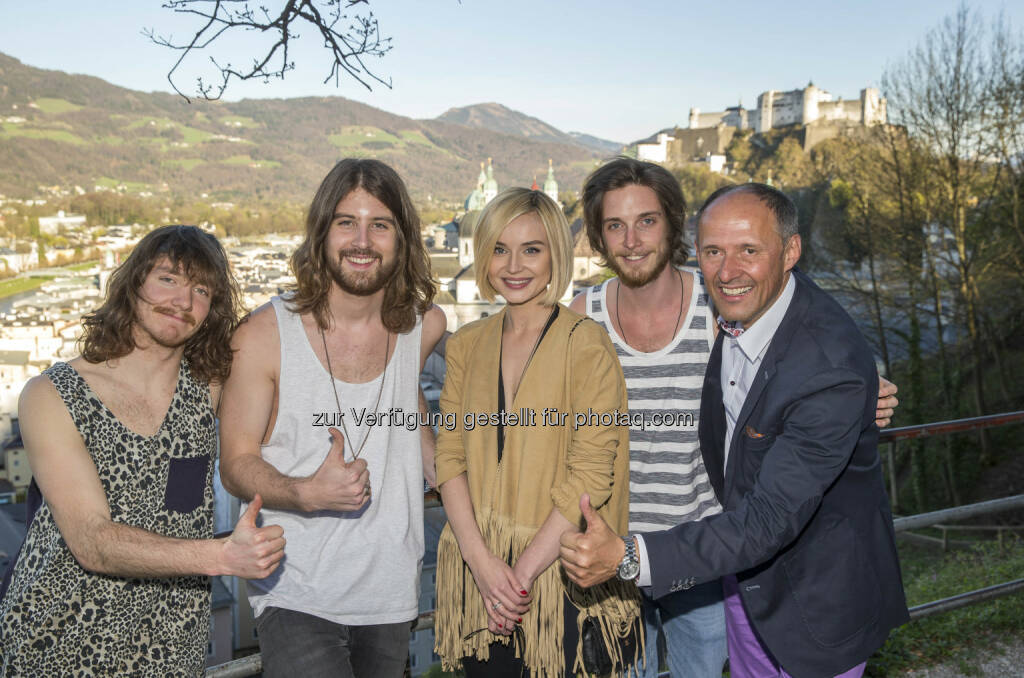Markus Christ, Dominic Muhrer, Polina Gagarina, Florian Meindl, Leo Bauernberger: SalzburgerLand Tourismus: The Makemakes treffen Polina Gagarina in Salzburg, Foto: SLT/Kolarik, © Aussender (17.04.2015)