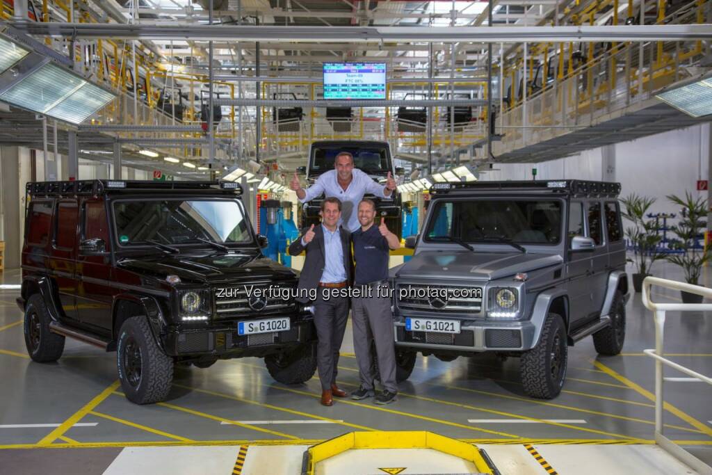 Mike Horn (Mitte) mit Gunnar Güthenke (links) und Kurt Bachmaier (rechts) bei der Übergabe der G-Klasse in Graz am 7. Mai 2015 (C) Daimler