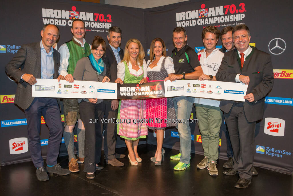 Leo Bauernberger (SalzburgerLand-Geschäftsführer), Georg Segl (Obmann des Tourismusverbandes Zell am See), Martina Berthold (Sportlandesrätin), Thomas Dieckhoff (CEO Ironman Europe, Middle East & Africa), Renate Ecker (Geschäftsführerin Zell am See-Kaprun Tourismus), Diana Bertsch (Vice President World Championship Events), Werner Dannhauser (OK-Team), Paul Schif (Geschäftsführer der Laureus Sport for Good Stiftung Deutschland & Österreich), Kurt Reiter (Bezirkshauptmannschaft Zell am See) und Peter Padourek (Bürgermeister von Zell am See).: Zell am See-Kaprun: Startschuss für Ironman 70.3 Weltmeisterschaft in Zell am See-Kaprun, (C) zellamsee-kaprun, © Aussendung (17.06.2015)