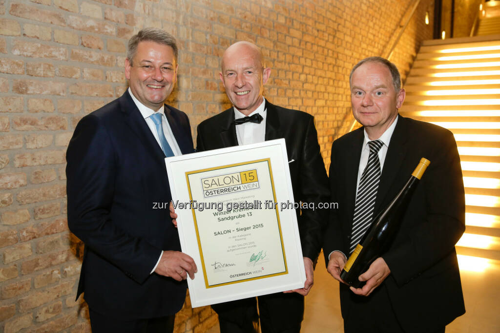 Bundesminister Andrä Rupprechter, Winzer Krems- Geschäftsführer Franz Ehrenleitner und Winzer Krems-Kellermeister DI Franz Arndorfer: Winzer Krems eG: Der beste Riesling Österreichs kommt aus der Kremser "Sandgrube 13", CAY/Roland Rudolph