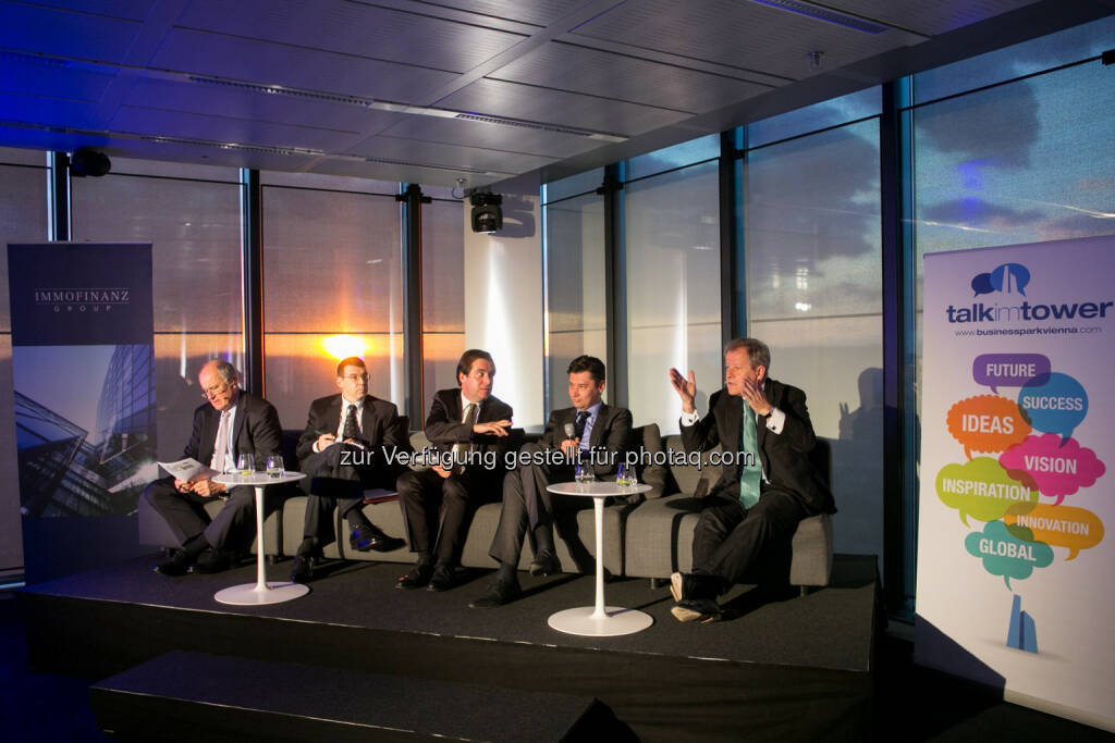 Karl Sevelda, Vorstandsvorsitzender Raiffeisen Bank International; Wladimir Kruschkow, Erster Botschaftsrat, Botschaft der Russischen Föderation in Österreich; Eduard Zehetner, CEO Immofinanz Group; Rainer Nowak, Chefredakteur „Die Presse"; Olexander Scherba, Außerordentlicher und Bevollmächtigter Botschafter der Ukraine in der Republik Österreich. http://blog.immofinanz.com/de/2015/04/21/talk-im-tower-di...