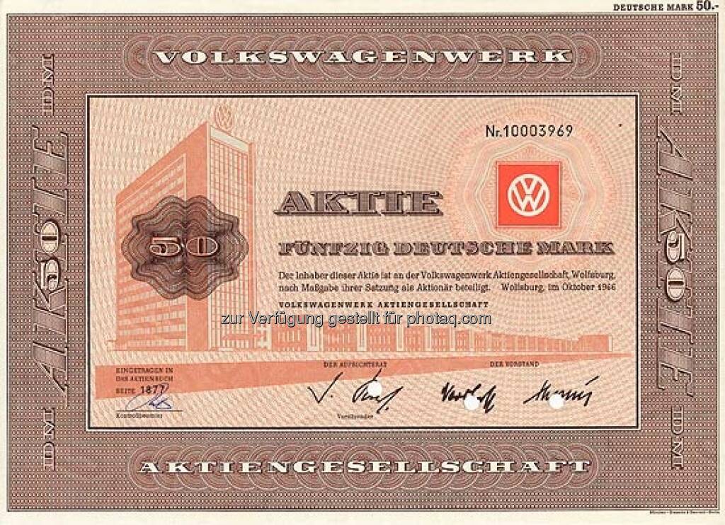Volkswagen: 1960 wurde die Volkswagenwerk GmbH in eine AG umgewandelt, erst 1985 firmierte der deutsche Autobauer aus Wolfsburg dann unter Volkswagen AG. Die alte Aktie über 50 DM stammt aus dem Jahr 1966., © mit freundlicher Genehmigung von 365aktien.de (01.02.2013)