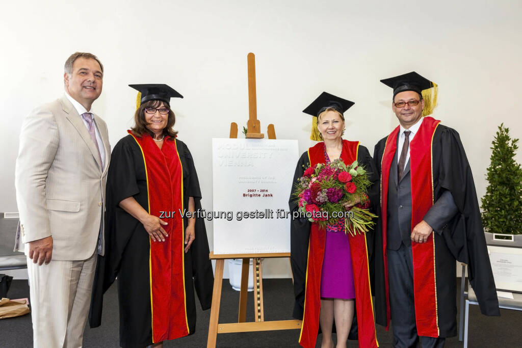 Walter Ruck ( Präsident der Wirtschaftskammer Wien), Dagmar Lund-Durlacher (Fakultätsleitung Tourism & Service Management, Modul University Vienna) Brigitte Jank (Nationalratsabgeordnete und ehem. Präsidentin der Wirtschaftskammer Wien) Karl Wöber (Rektor der Modul University Vienna): Modul University Vienna: Brigitte Jank wird Ehrensenatorin der Modul University Vienna, © Aussendung (06.07.2015)