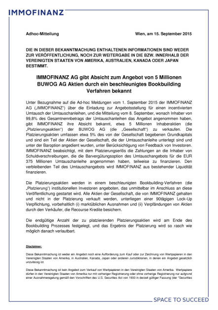 Immofinanz will 5 Mio. Buwog-Aktien platzieren, Seite 1/2, komplettes Dokument unter http://boerse-social.com/static/uploads/file_366_immofi... (15.09.2015)