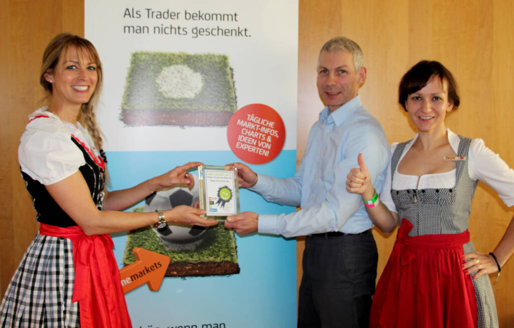 Smeil Award 2015 Corporate Sieger Deutschland: Den Pokal übergab Medienpartnerin Nina Bergmann (finanzen.at / Springer) in den Räumlichkeiten von onemarkets in München an Richard Pfadenhauer und Tanja Winne , © Aussendung (19.10.2015)